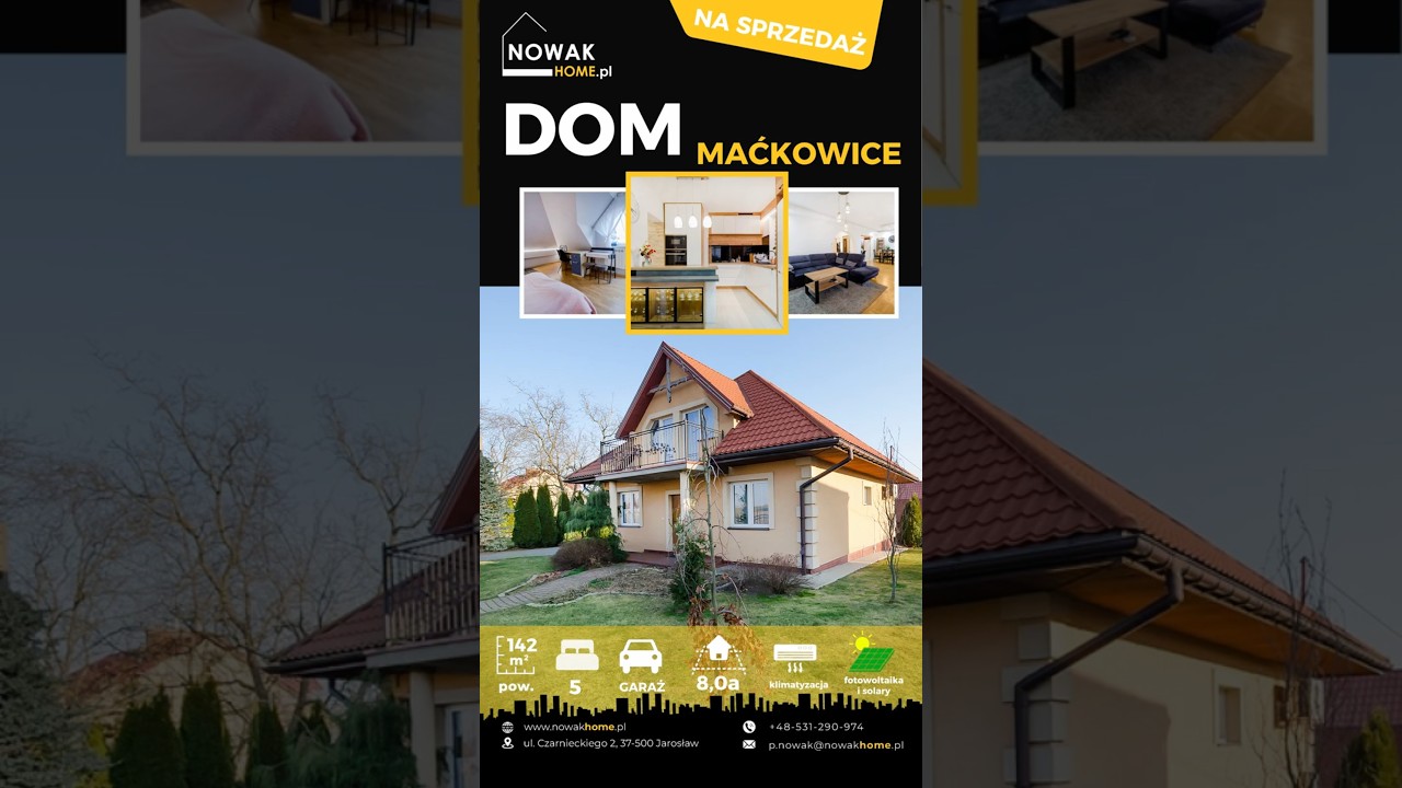 Maćkowice gmina Żurawica. Oferujemy na sprzedaż wyjątkowy dom o powierzchni użytkowej 142 m², położony w spokojnej i malowniczej miejscowości Maćkowice. To idealna oferta dla osób szukających przestrzeni, komfortu oraz nowoczesnych technologii w jednym. Nieruchomość z pięcioma pokojami, salonem z jadalnią i nowoczesną kuchnią została wybudowana w 2003r.Ostatni remont salonu jadalni i kuchni został przeprowadzony w 2021r.Dom wyposażony jest 2-funkcyjny piec gazowy, a system fotowoltaiczny o mocy 6 kW (falownik do 10 kW) i solary zapewniają energooszczędność. Dodatkowo klimatyzacja zwiększa komfort codziennego życia. Nieruchomość posiada uregulowany stan prawny i jest wolna od hipotek,Na działce o pow. 800 m² znajduje się również murowany garaż o powierzchni 50 m², Teren nieruchomości jest w całości ogrodzony.